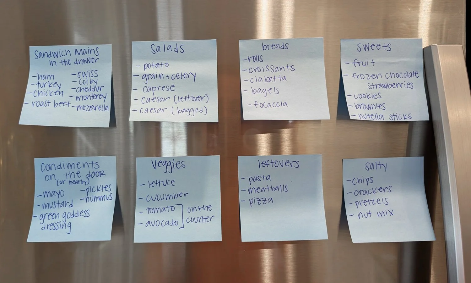 From an analog perspective, we found that post-its were incredibly useful all weekend to help share information. We put notes on open bottles in the fridge so people knew which ones to grab first. We put notes on the chai to highlight the flavor profile of each option. We labeled the Jell-o shots so people knew the flavor and how much alcohol was in each one. And the day everyone went to the beach, we even used the Post-It notes to highlight all of the food options available to people. Furthermore, I mentioned it above, but we found that giving each person a differently patterned koozie created less room for confusion with open cans around the house.